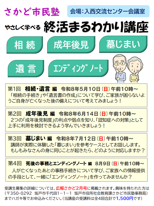 狭山市生涯学習ボランティア(さやまルシェ)に登録してありますので、サークルの研修などに当事務所の公開講座をご利用ください。