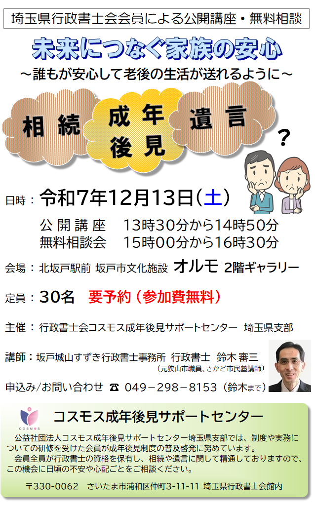 公開講座・無料相談会のお知らせ (主催:コスモス埼玉)
