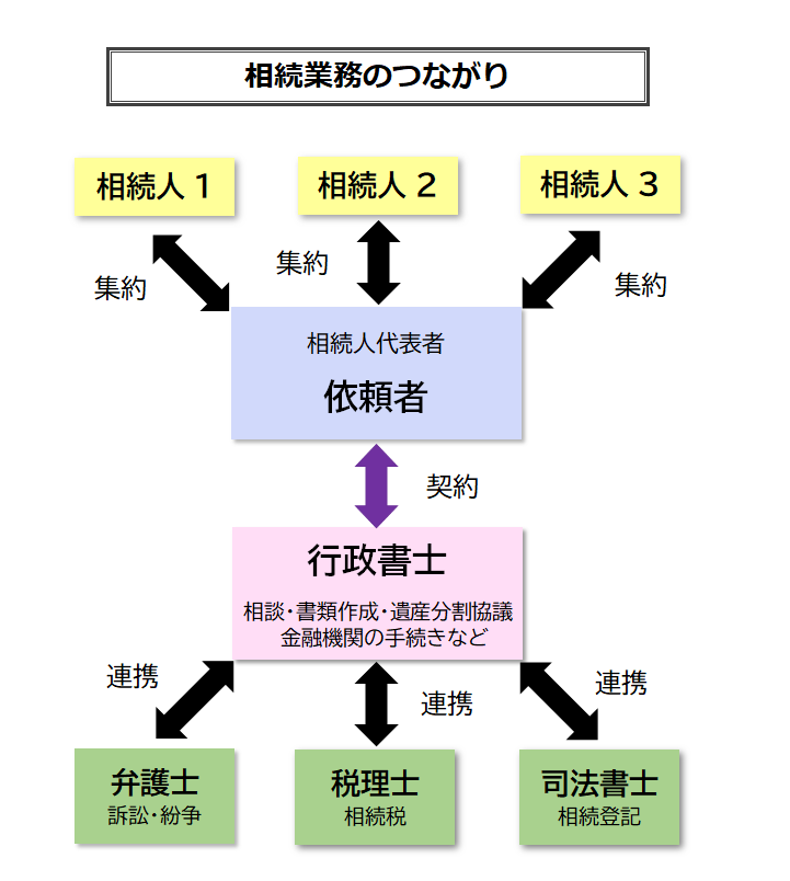 以下は相続の手続きを例に、相談者をとりまく他士業との連携体制を図示したものになります。