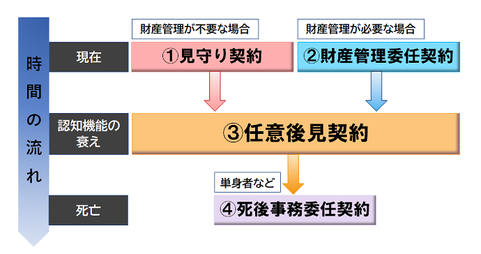 見守り契約、財産管理委任契約、死後事務委任契約は単体で結ぶことは稀で、多くの場合任意後見契約と組み合わせて使います。