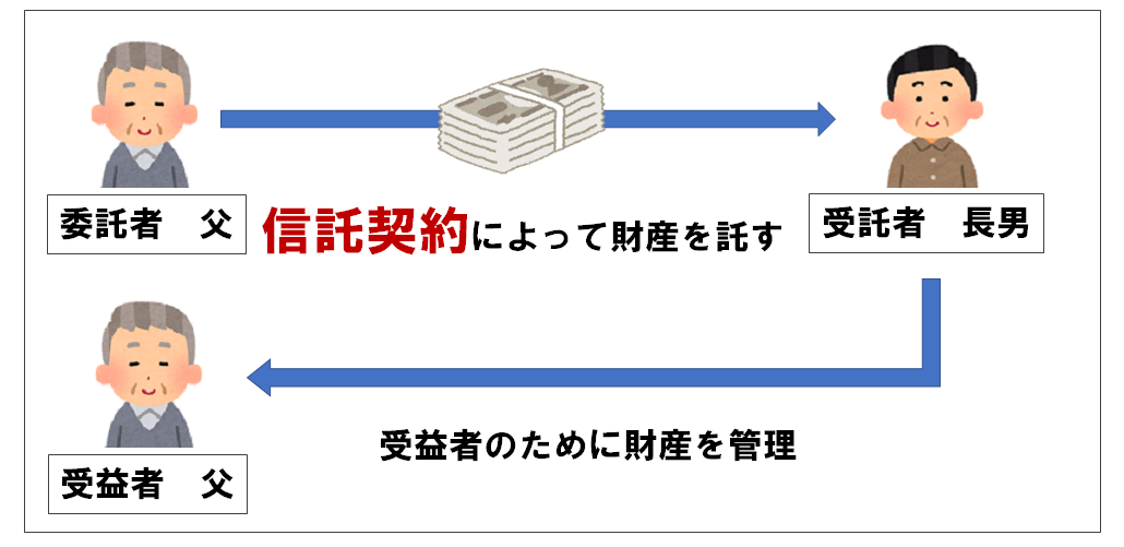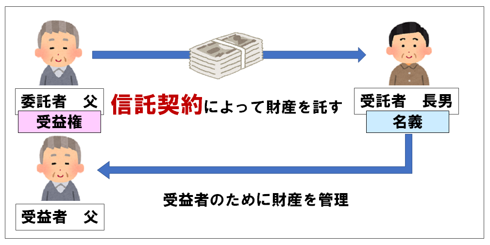 二つに分離した所有権のうち、利益を受ける権利である「受益権」は委託者兼受益者としての父に残し、「名義」のみを受託者である長男に移し、長男が財産を管理、受益者である父のために使います。