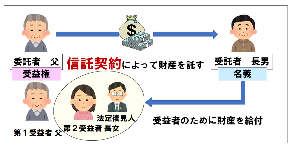 自分(父)が認知症になったり、死亡してしまった後は、長女に法定後見人を選任するよう信託契約の中で長男に頼んでおきます。
