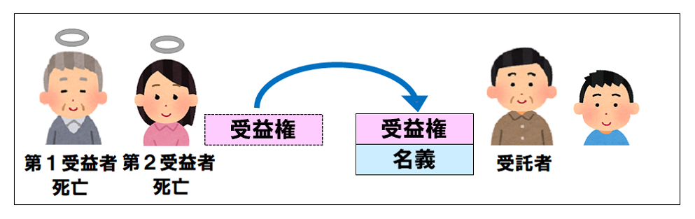 残った信託財産は、元の「名義」+「受益権」の形に戻り、信託契約で存命であれば長男に、長男が死亡していれば長男の息子に渡すことができます。