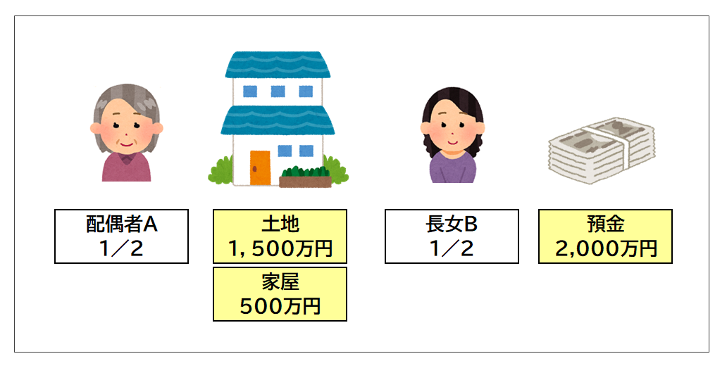 相続人は配偶者Aと長女Bで相続財産は1,500万円の土地、500万円の家屋と銀行の定期預金2,000万円で、総額4,000万円であったとします。