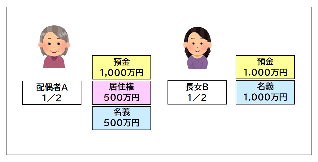 これを配偶者Aと長女Bで法定相続分の1/2ずつで分配します。
